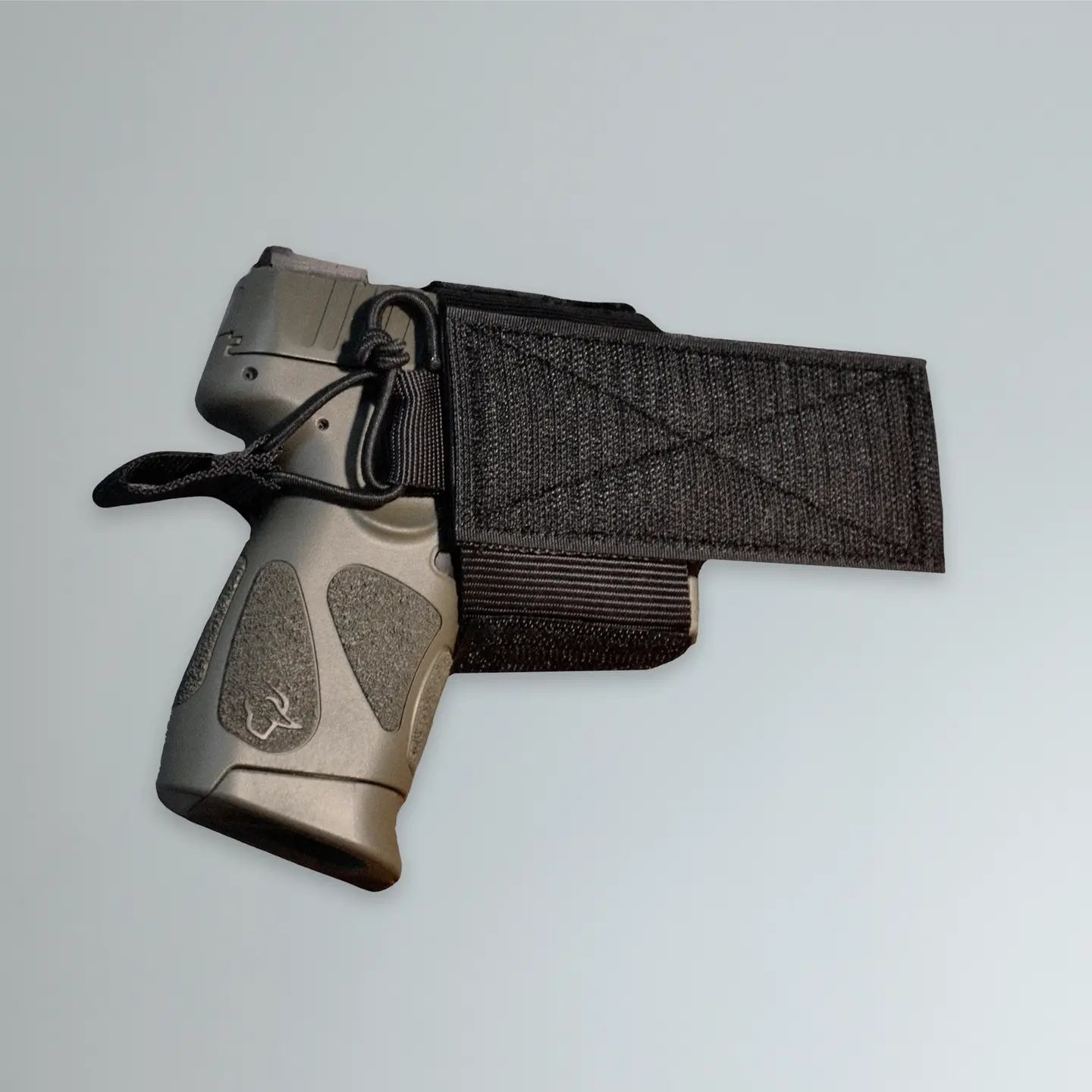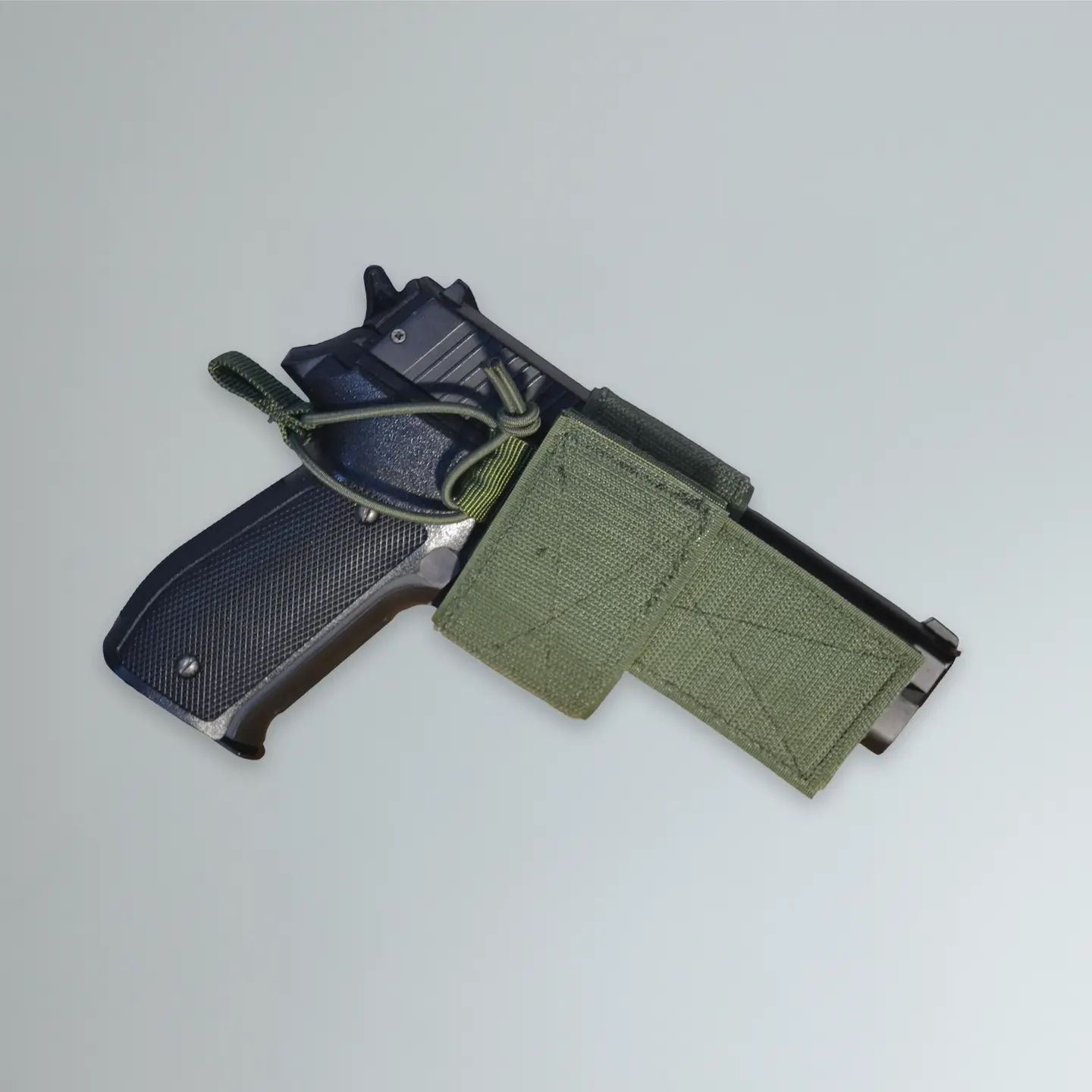Produzido com fita de alta resistência e fechos de contato originais da marca Velcro®, envolve a arma com firmeza e permite fixação em qualquer superfície compatível com Velcro®.